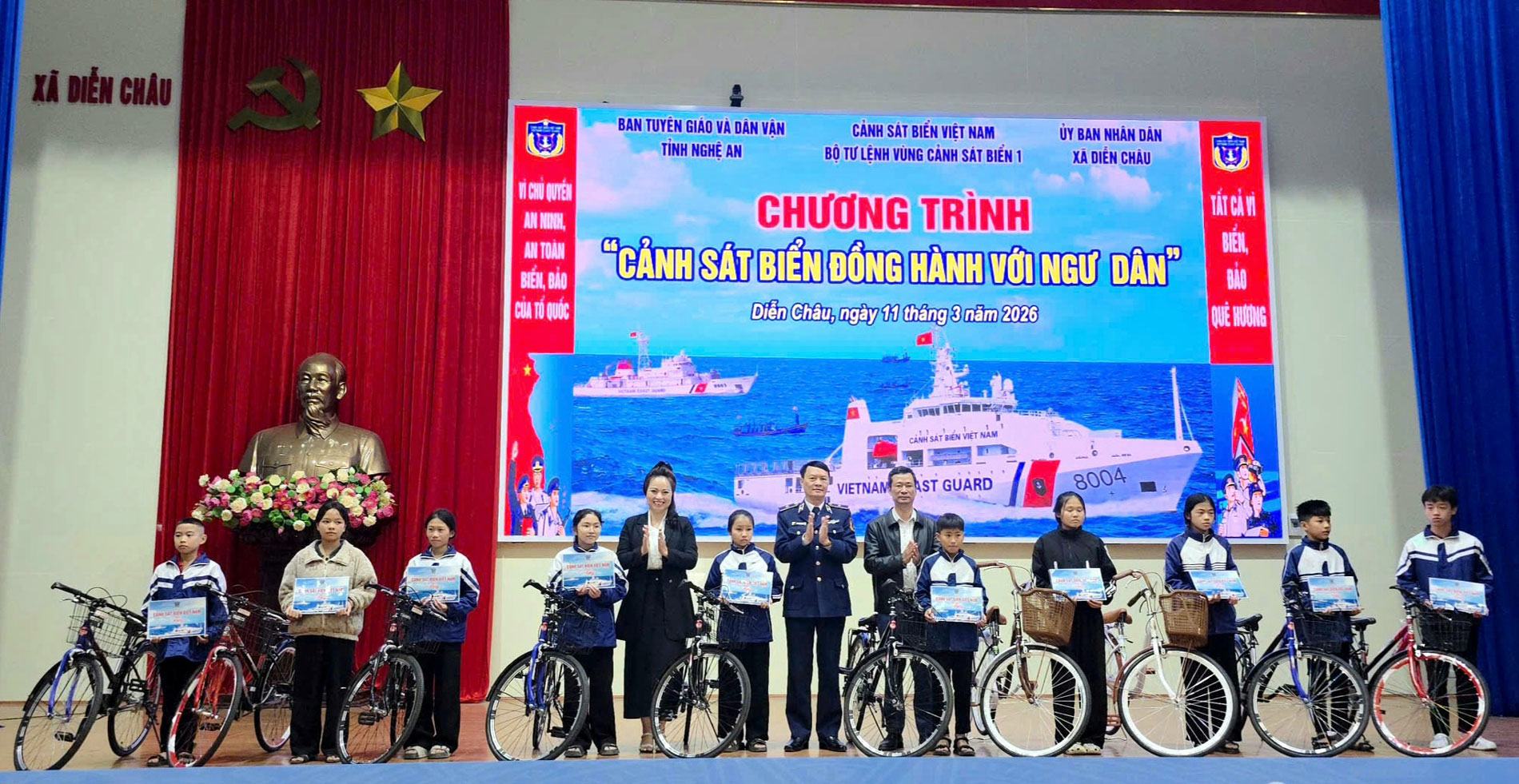 Ngày 11/3, tại xã Diễn Châu (tỉnh Nghệ An), Bộ Tư lệnh Vùng Cảnh sát biển 1 phối hợp với Ban Tuyên giáo và Dân vận Tỉnh ủy Nghệ An, cấp ủy, chính quyền địa phương tổ chức Chương trình “Cảnh sát biển đồng hành với ngư dân” với nhiều hoạt động thiết thực, góp phần tuyên truyền pháp luật, hỗ trợ ngư dân và chăm lo học sinh có hoàn cảnh khó khăn trên địa bàn.