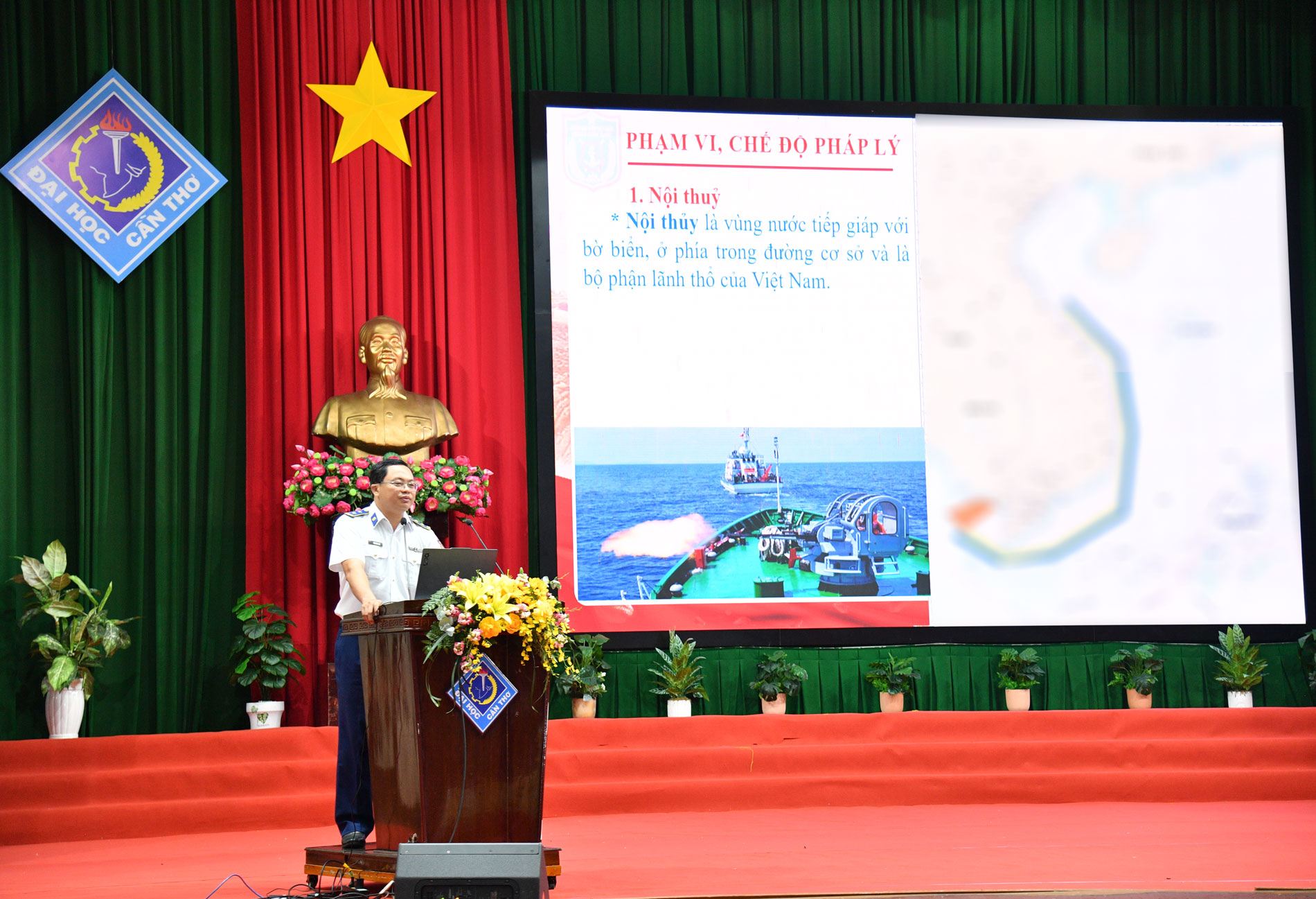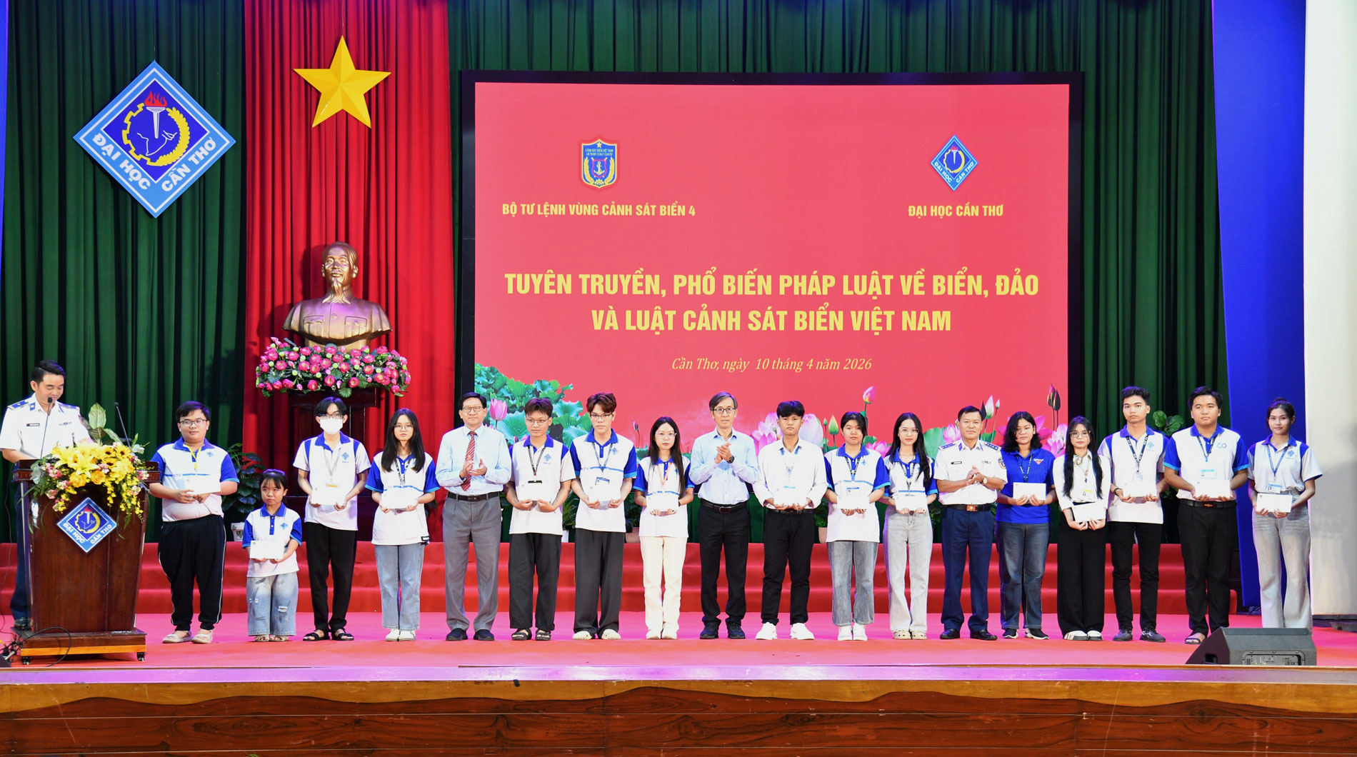 Sáng 10/4, tại Đại học Cần Thơ, Bộ Tư lệnh Vùng Cảnh sát biển 4 phối hợp với Ban Giám hiệu nhà trường tổ chức tuyên truyền pháp luật về biển, đảo và Luật Cảnh sát biển Việt Nam cho cán bộ, giảng viên, sinh viên nhà trường