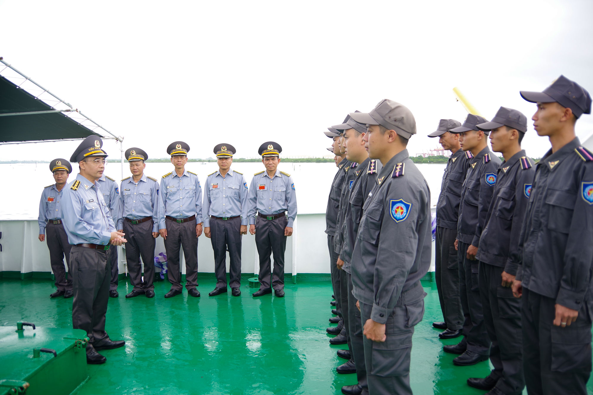 Đồng chí Vũ Văn Tài - Bí thư Đảng ủy Chi đội Kiểm ngư số 3 giao nhiệm vụ, động viên các tàu trước khi lên đường làm nhiệm vụ.