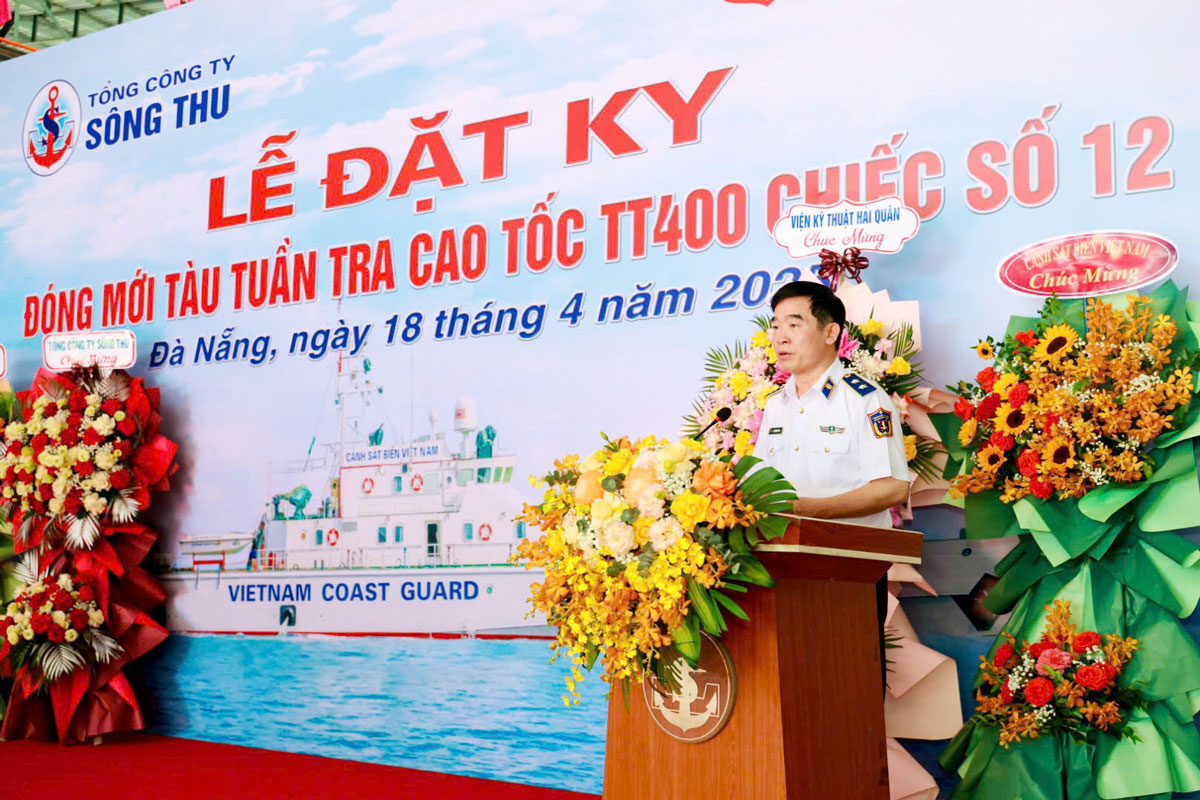 Thay mặt Đảng ủy, Thủ trưởng Bộ Tư lệnh Cảnh sát biển, Trung tướng Bùi Quốc Oai - Chính uỷ Cảnh sát biển Việt Nam biểu dương sự nỗ lực, chuẩn bị chu đáo của Tổng công ty Sông Thu và sự phối hợp chặt chẽ giữa các cơ quan chức năng của Cảnh sát biển Việt Nam và các đơn vị có liên quan đã giúp cho Lễ đặt ky đóng mới tàu tuần tra cao tốc TT-400 chiếc số 12 được diễn ra đúng kế hoạch; làm cơ sở để triển khai các nội dung tiếp theo trong quá trình thi công đóng mới tàu.